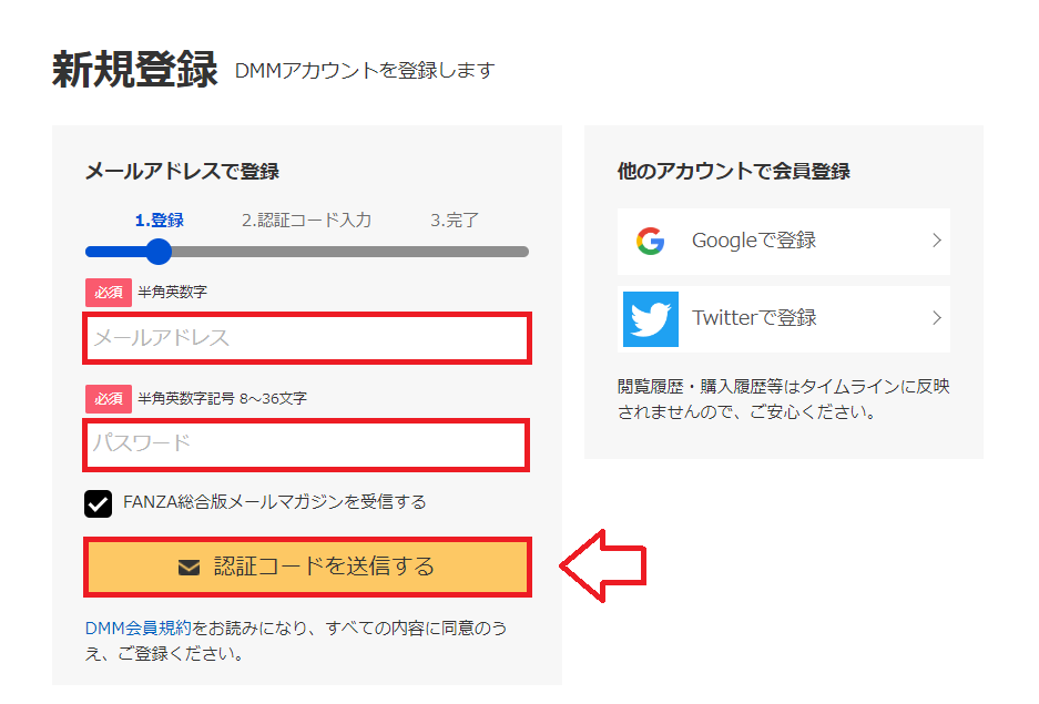 メールアドレスとパスワードを入力。認証コードを送信。